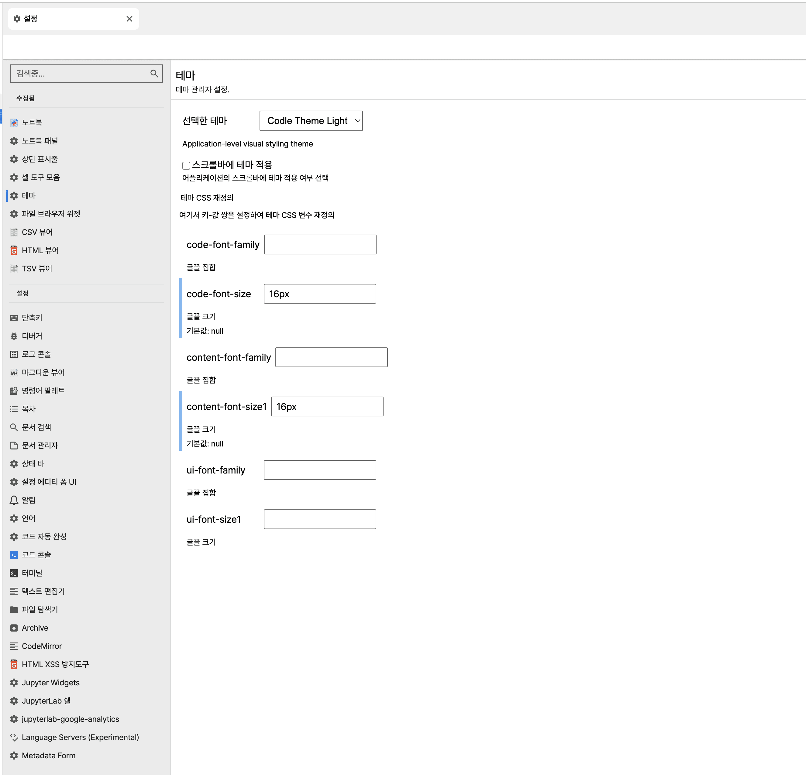 테마탭을 누른 다음 비어있는code-font-size(코드 셀의 텍스트 크기)와content-font-size1(마크다운 셀의 텍스트 크기)에 값을 입력해 주시기 바랍니다. 해당 값은(숫자)px의 형태로 입력해야 하며, 입력 즉시 화면이 한 차례 깜빡이고 설정이 적용됩니다.