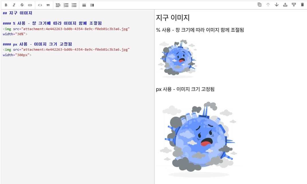 다만, 이미지를 드래그해서 삽입할 경우 마크다운 문법으로 자동 변환되기 때문에 크기 조정을 위해서는 이를 HTML 태그 형식으로 바꿔줘야 합니다.