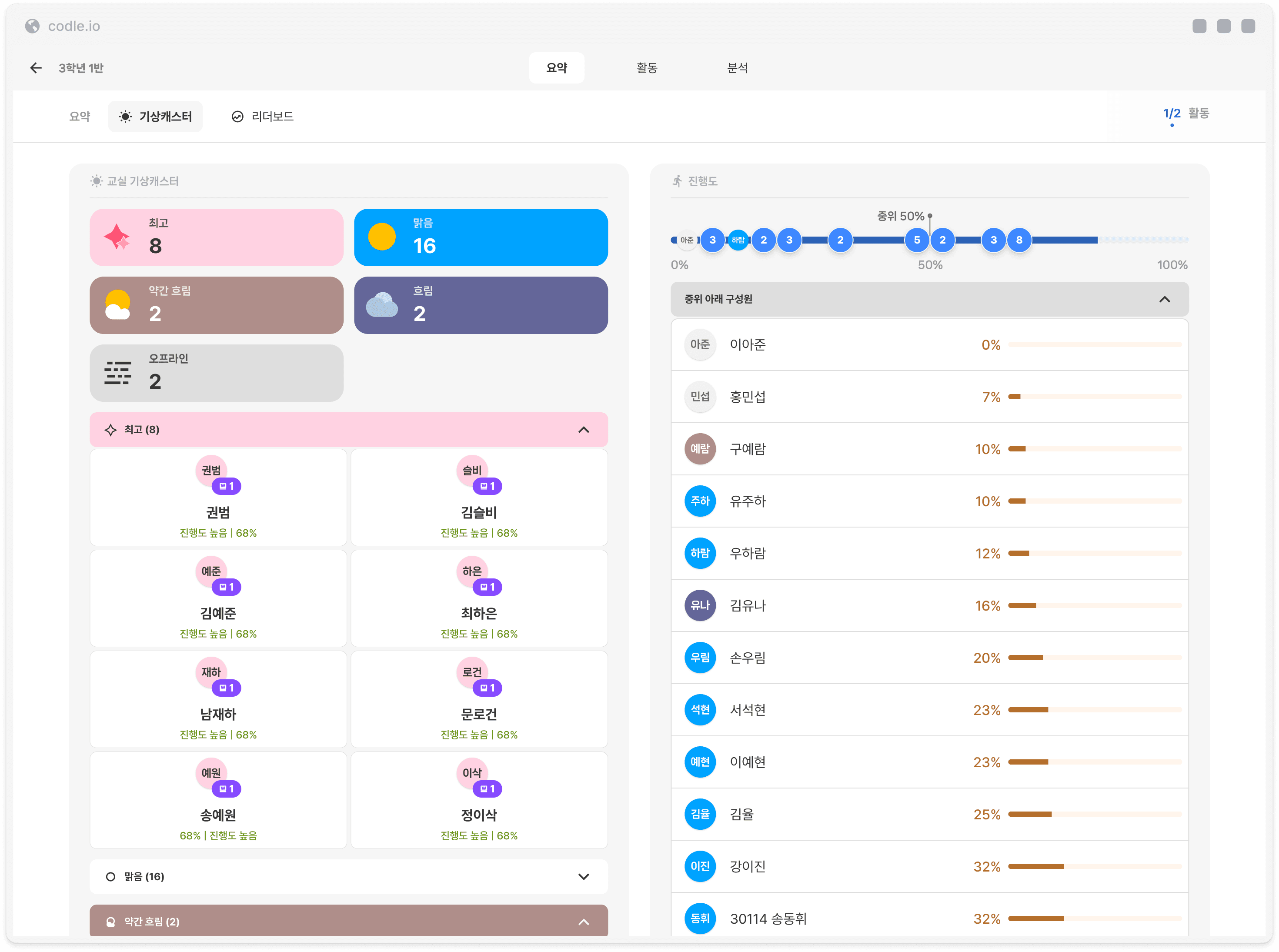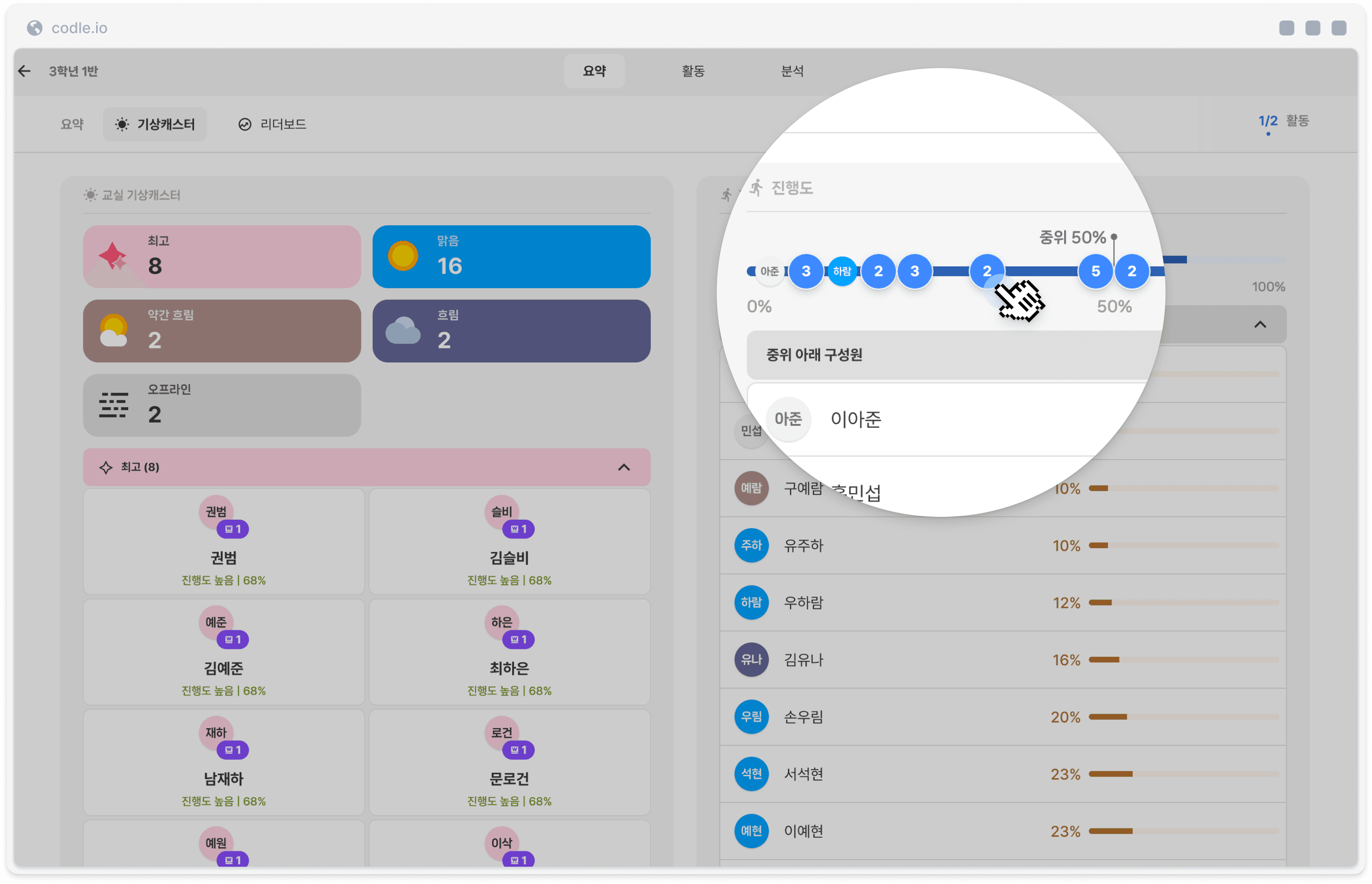 💡 기상캐스터는 학생들의 우열을 반영하는 지표가 아닙니다. 예를 들어 수업 진도를 따르지 않고 다음 내용으로 혼자 넘어간 학생의 경우, 기상캐스터에선 '최고'로 표시되지만 실제로는 수업에 충실하지 않은 학생일 수 있습니다. 이렇듯 수업 상황에 따라 분류 기준과 실제 성취도 또는 참여도가 다를 수 있기 때문에, 선생님의 수업 진행에 도움이 될 수 있도록 해석해 주시기 바랍니다.